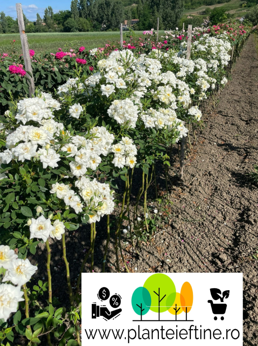 Flori: semi-duble, crem/alb cu diametrul ~4 cm, aspect plat, în ciorchini